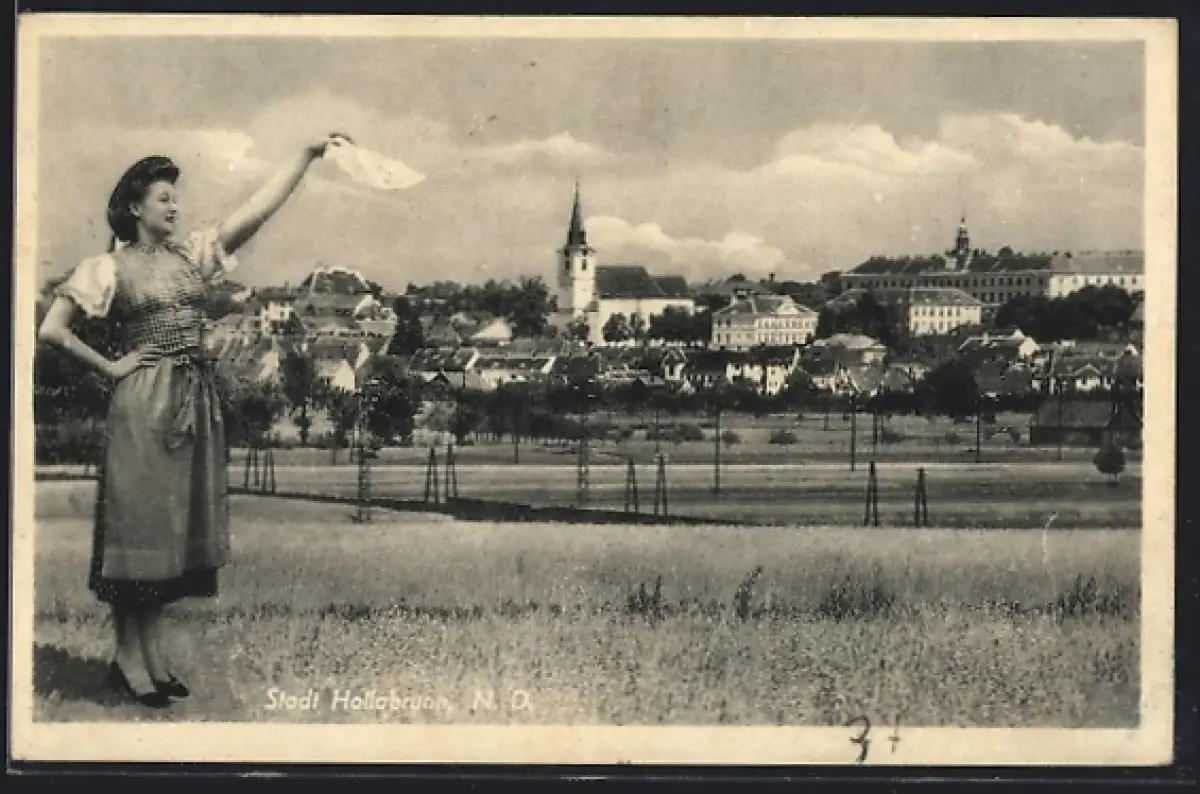 AK Hollabrunn, Ortsansicht, Frau im Dirndel winkt