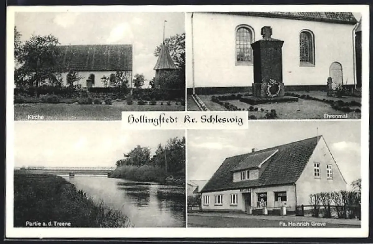 AK Hollingstedt /Schleswig, Kirche, Ehrenmal, Geschäft Heinrich Greve, Partie an der Treene