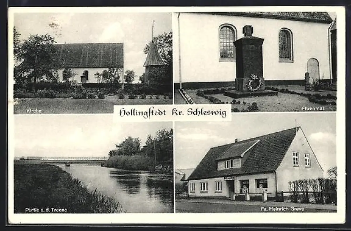 AK Hollingstedt /Schleswig, Kirche, Ehrenmal, Partie a. d. Treene, Fa. Heinrich Greve