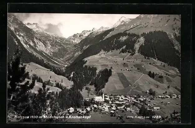 AK Holzgau, Ortsansicht mit Mädelejoch und Krottenkopf