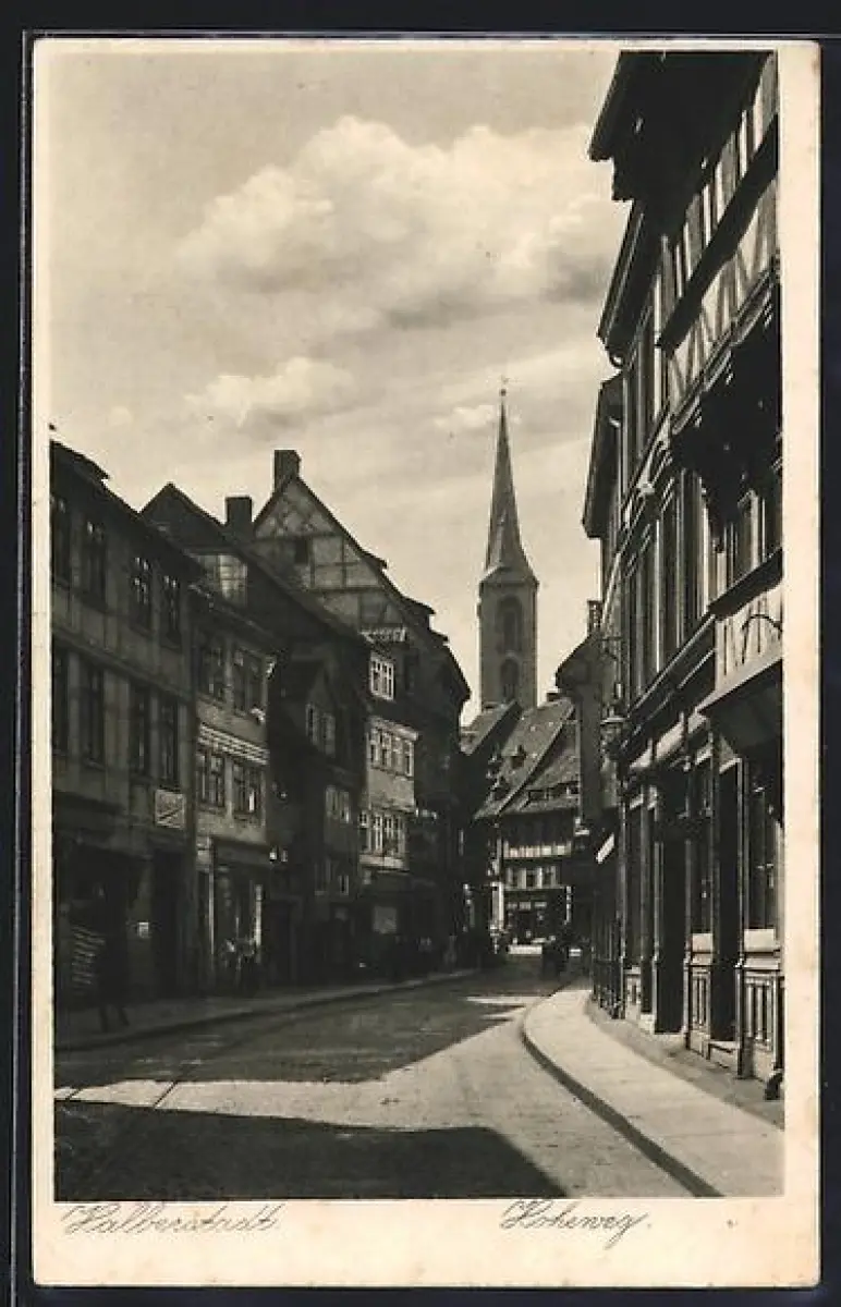 AK Holzminden, Strasse Hoheweg in der Altstadt, Kirche, Strassenansicht
