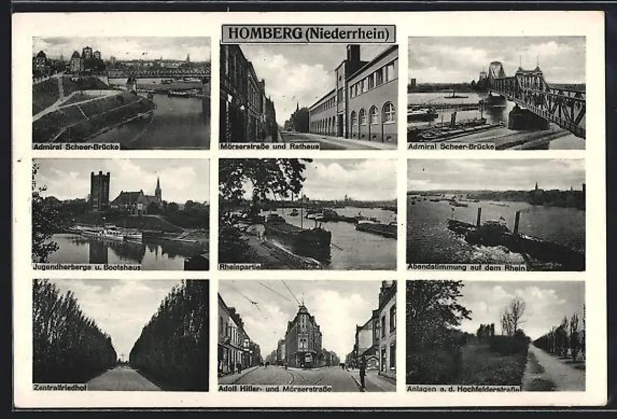 AK Homberg /Niederrhein, Admiral-Scheer-Brücke, Möserstrasse und Rathaus, Strasse