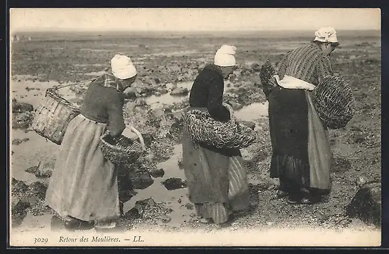 AK Honfleur, Retour des Moulières, Frauen mit Muschelkörben auf dem Heimweg