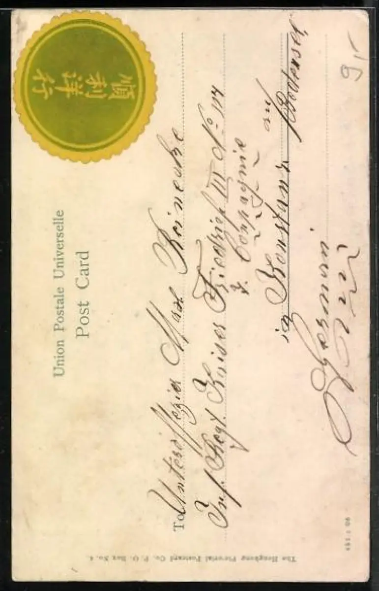 Personenbezogene Daten auf der Rückseite der Karte wurden durch blauen Textmarker unkenntlich gemacht. Die blauen Stellen sind auf die Vorderseite durchgeweicht und wirken sich negativ auf das Postkartenfoto aus