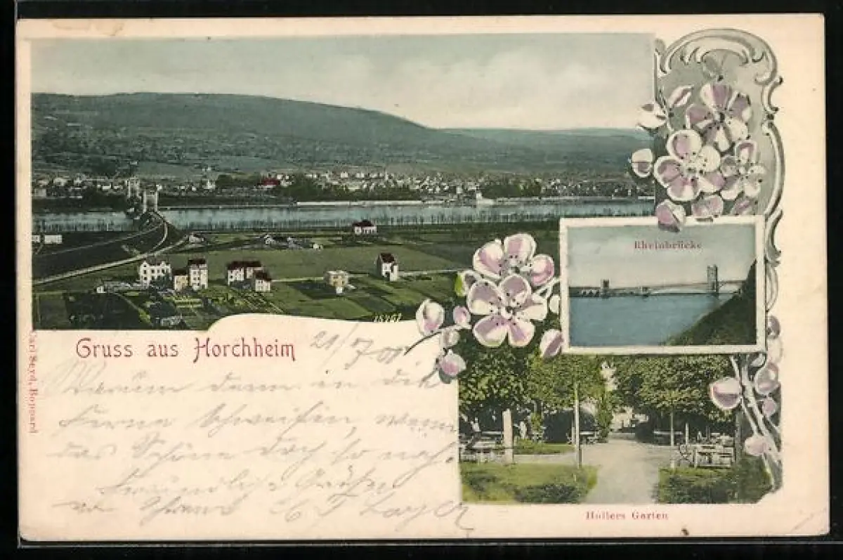 AK Horchheim / Rhein, Gasthof Hollers Garten, Rheinbrücke, Ortsansicht aus der Vogelschau