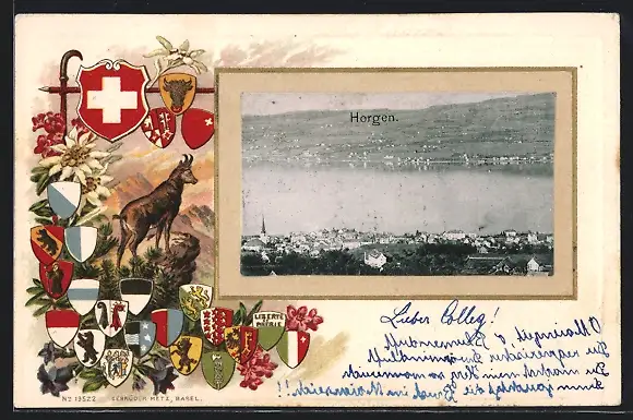 AK Horgen, Ortsansicht mit Kirche, Wappen