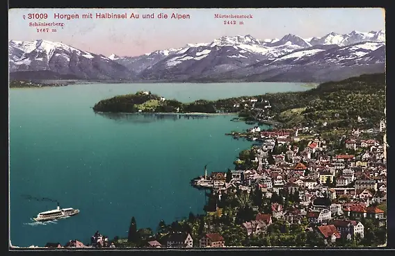 AK Horgen, Teilansicht mit Halbinsel Au und Alpen, Dampfer