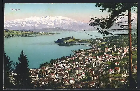 AK Horgen, Totalansicht mit See und Bergpanorama