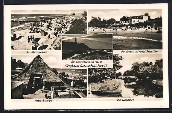 AK Horst / Ostseebad, Der Leuchtturm bei Nacht, Altes Rauchhaus, Am Badestrand