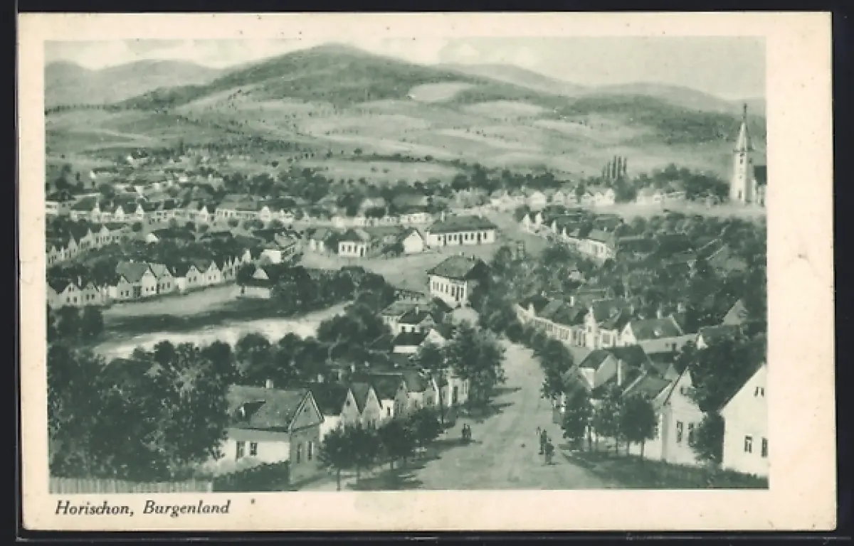 AK Hortischon /Burgenland, Totalansicht mit Strasse und Bergpanorama