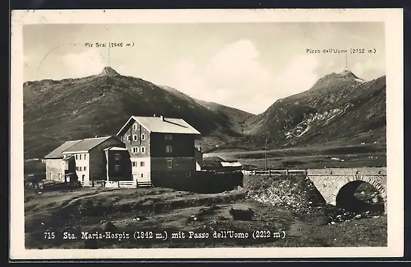 AK Hospiz Sta. Maria, Häusergruppe mit Passo dell`Uomo u. Piz Scai