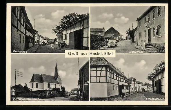 AK Hostel i. Eifel, Dorfstrasse, Partie an der Kirche, Strassenpartie