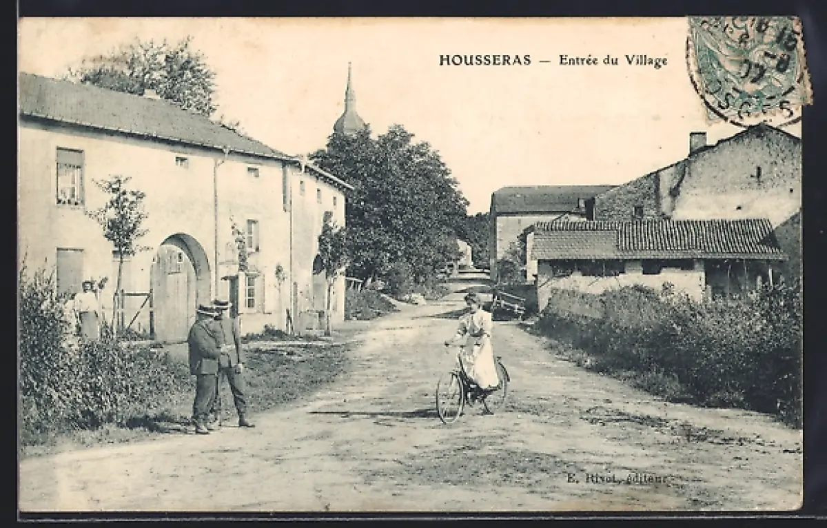 AK Housseras, Entrée du Village avec cycliste et habitants sur la route
