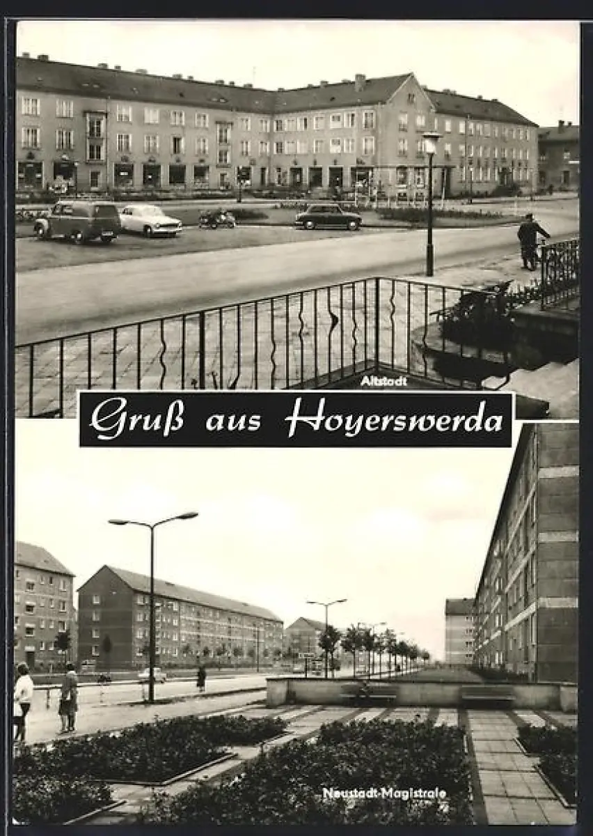 AK Hoyerswerda, Partie aus der Altstadt, Neustadt-Magistrale mit Rabatten