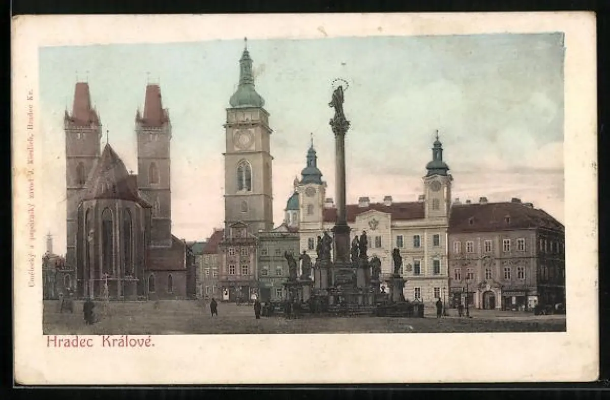 AK Hradec Kralove, Platz mit Säulendenkmal und Kirche