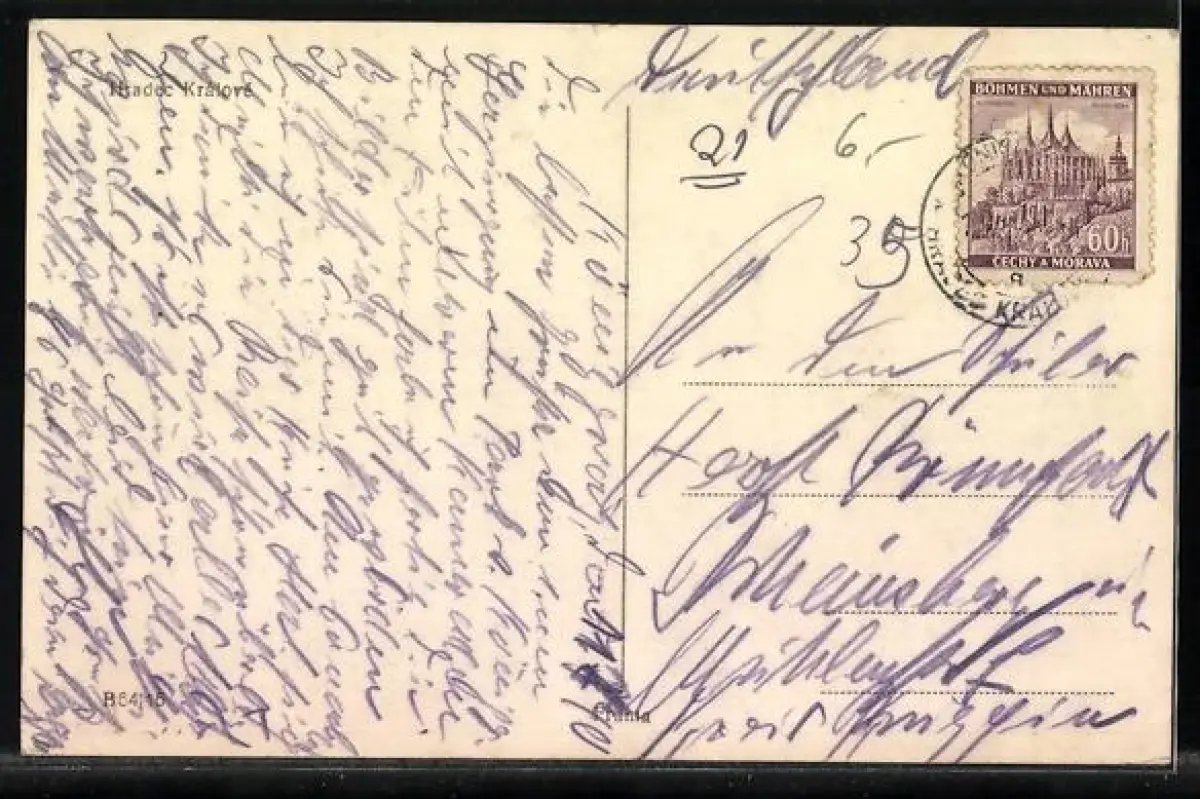 Personenbezogene Daten auf der Rückseite der Karte wurden durch blauen Textmarker unkenntlich gemacht. Die blauen Stellen sind auf die Vorderseite durchgeweicht und wirken sich negativ auf das Postkartenfoto aus