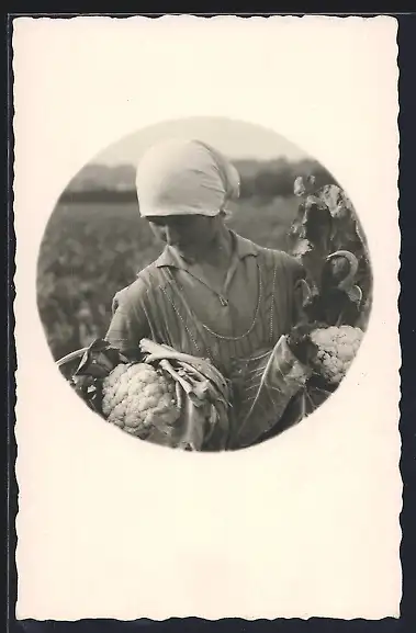 AK Hübsche Bäuerin mit geerntetem Blumenkohl