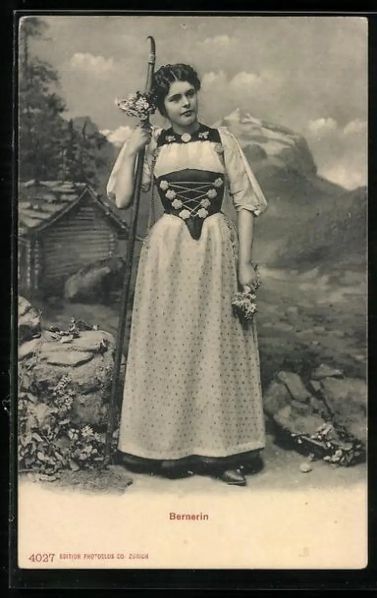 AK Hübsche Bernerin in Trachtenkleidung vor einer Gebirgskulisse