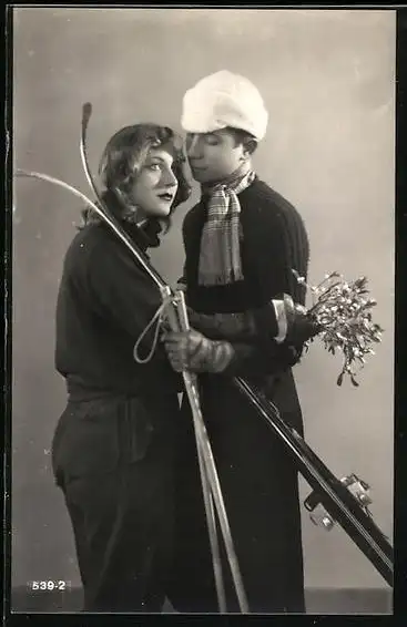 AK Hübsches Paar mit Skiern und Mistelzweigen