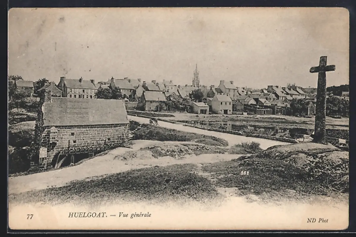 AK Huelgoat, Vue générale du village avec croix en pierre et maisons anciennes