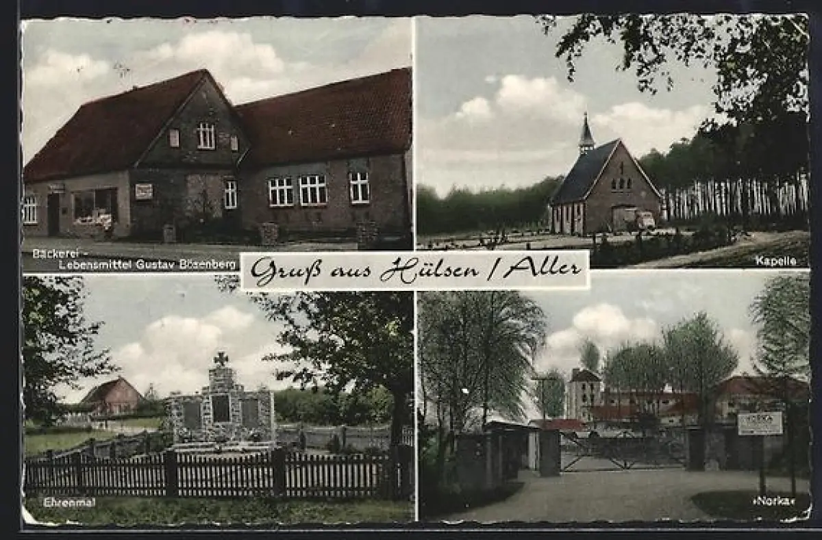 AK Hülsen /Aller, Bäckerei Lebensmittel Gustav Bösenberg, Kapelle, Ehrenmal, Norka