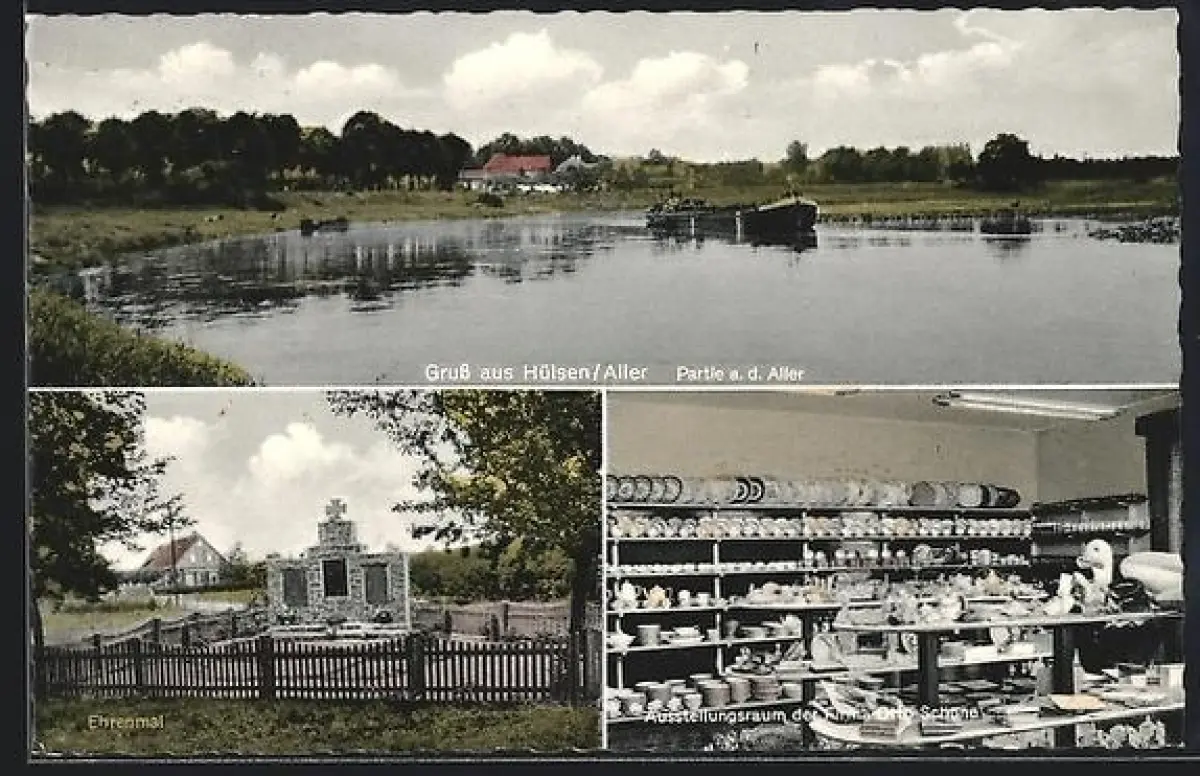 AK Hülsen /Aller, Partie an der Aller, Ehrenmal, Ausstellungsraum der Firma Otto Schöne