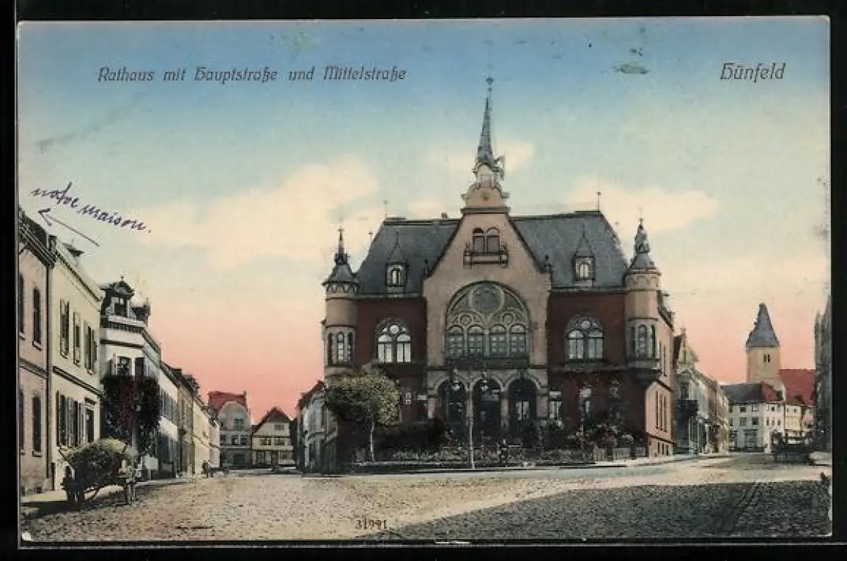 AK Hünfeld, Rathaus mit Hauptstrasse und Mittelstrasse