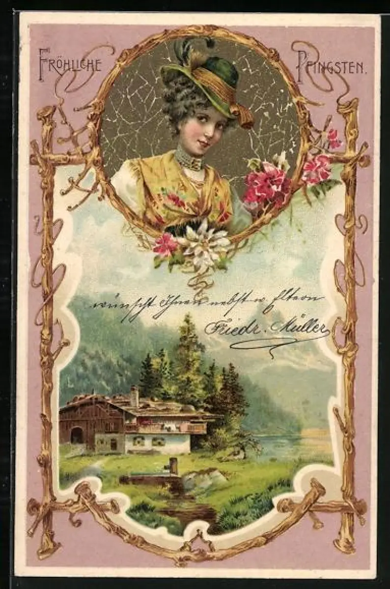 AK Hütte vor Bergpanorama, Porträt einer jungen Frau in Tracht, Fröhliche Pfingsten