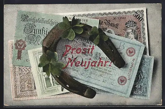 AK Hufeisen mit Kleeblättern auf Geldscheinen, Neujahrsgruss