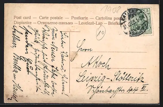 alte Ansichtskarte, gelaufen 1908, Eckknick re. unten, guter Zustand