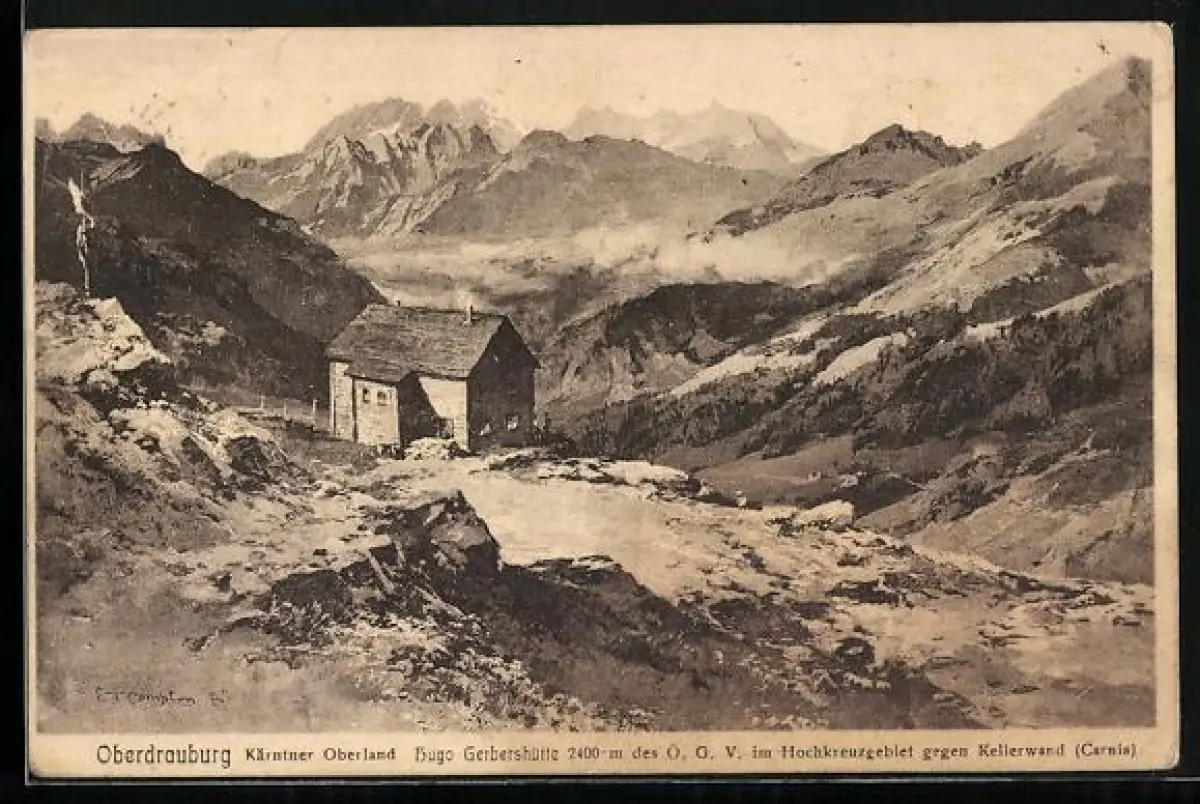 AK Hugo Gerbershütte, Berghütte des Ö. G. V. im Hochkreuzgebiet gegen Kellerwand Carnia