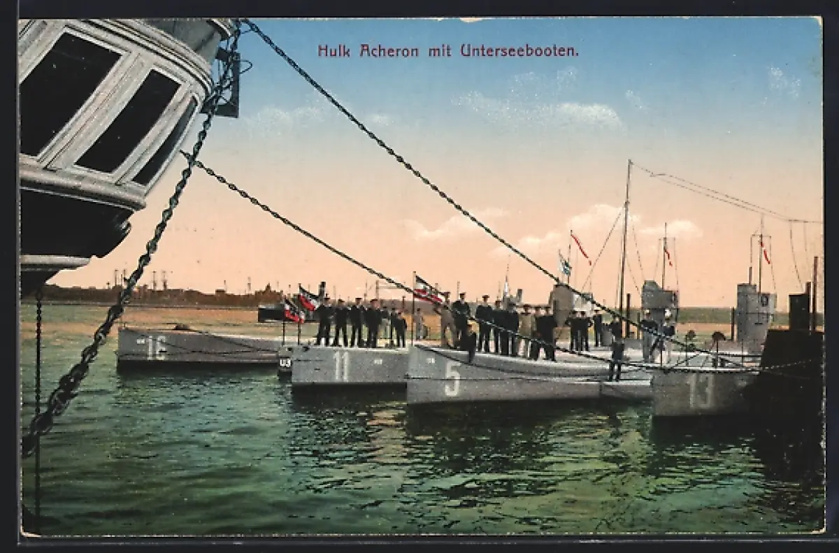 AK Hulk Acheron mit U-Booten U 16, U 11, U 5 und U 13