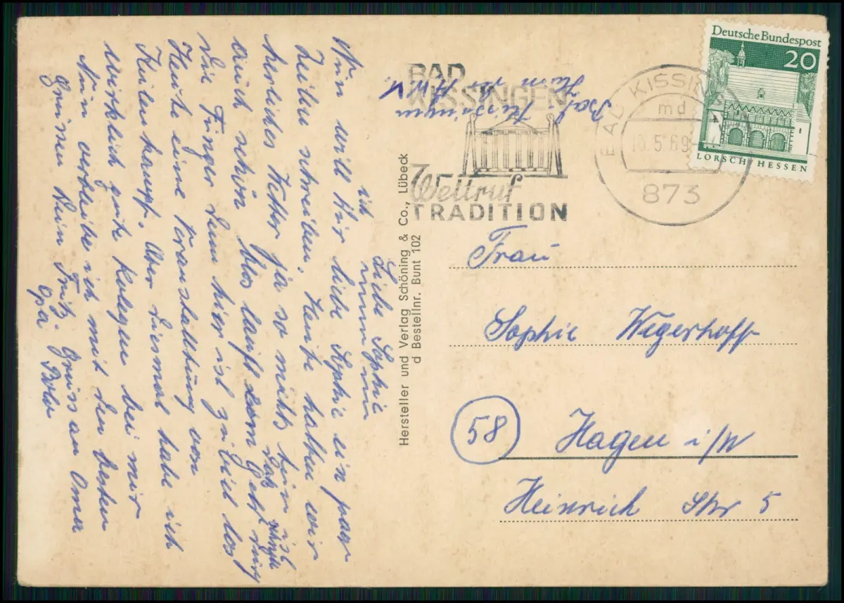 Rückseite: Mit Deutsche Bundespost 20 Pfennig Lorsch Hessen-Marke, Stempel Bad Kissingen 13.5.1959, handschriftliche Nachricht an Sophie Wagerhoff, Hagen i/W. Zustand: Guter gebrauchter Zustand, leichte Alters- und Gebrauchsspuren.