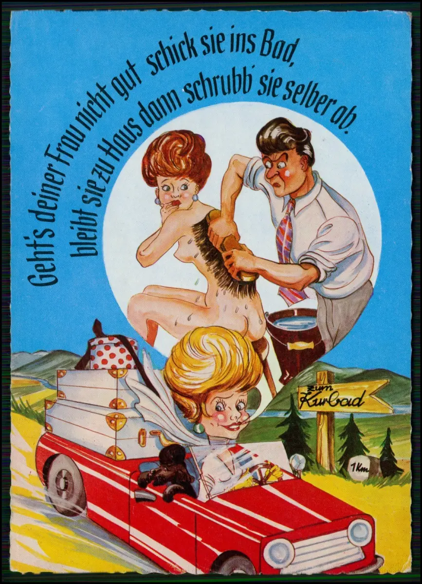 Humorvolle Karikatur – Mann schrubbt Frau im Bad – satirische Darstellung mit Vers „Geht’s deiner Frau nicht gut, schick sie ins Bad…“. Typisch für 1950er-Jahre Nachkriegshumor.