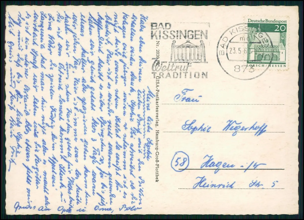 Rückseite: Mit handschriftlichem Text, gestempelt Bad Kissingen 23. 5. 56, frankiert mit Deutsche Bundespost 20 Pfennig Lorsch Hessen.