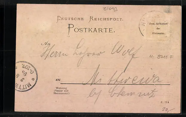 alte Ansichtskarte, gelaufen 1898, Briefmarke entfernt, Eckknick unten li. u. oben re., Stempelspur, guter Zustand