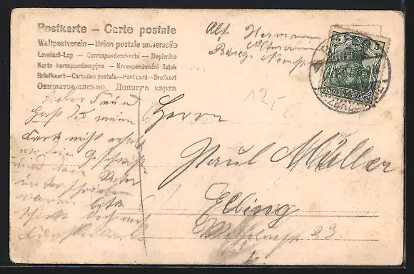 gelaufen 1907, Eckknick unten re. und oben li., guter Zustand