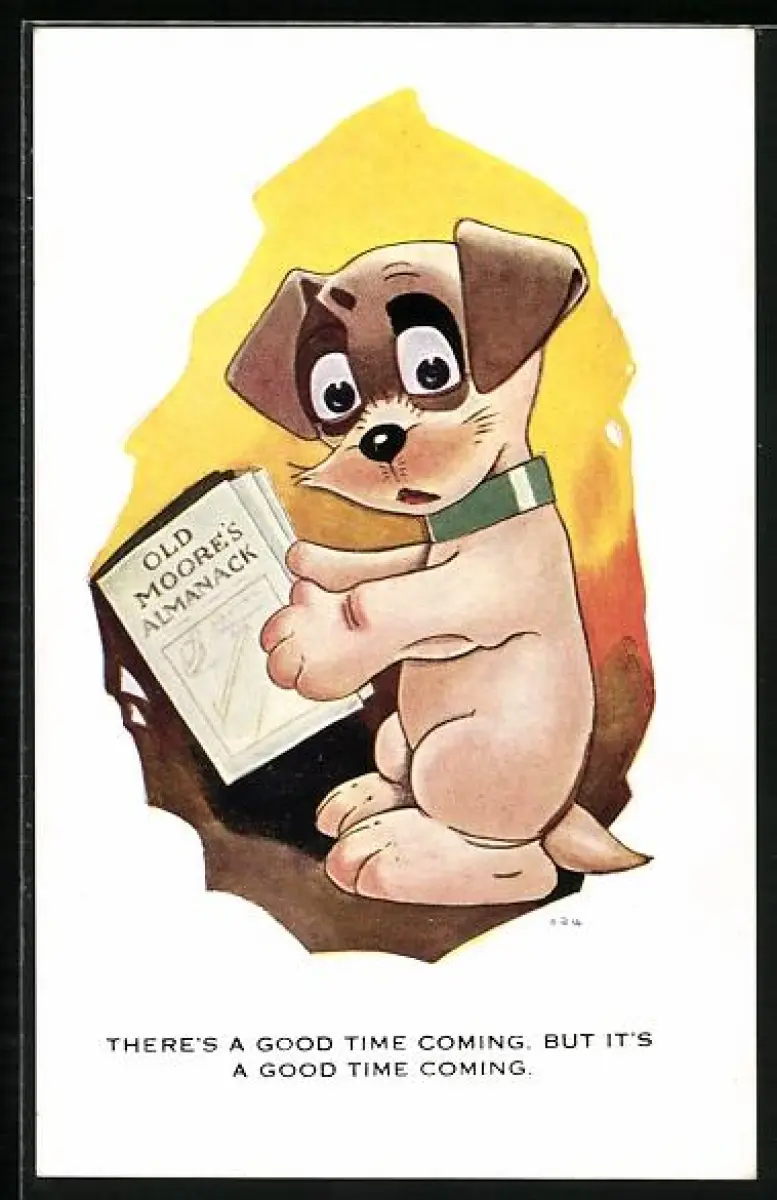 AK Hund erstaunt über Inhalt von Old Moore`s Almanack, There`s a good time coming