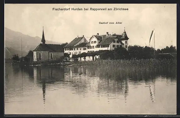 AK Hurden, Fischerdorf mit Kirche und Gasthof zum Adler