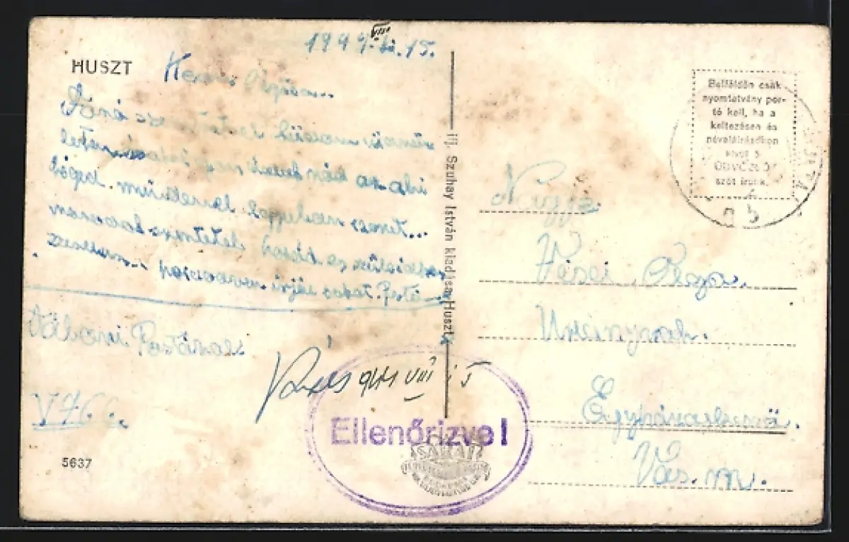 Personenbezogene Daten auf der Rückseite der Karte wurden durch blauen Textmarker unkenntlich gemacht. Die blauen Stellen sind auf die Vorderseite durchgeweicht und wirken sich negativ auf das Postkartenfoto aus