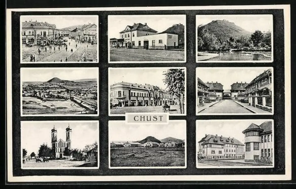 AK Huszt, Panorama, verschiedene Ortsansichten und Gebäudeansichten