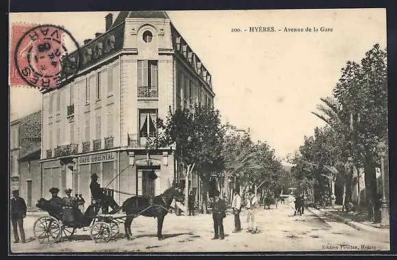 AK Hyères, Avenue de la Gare avec calèche et passants