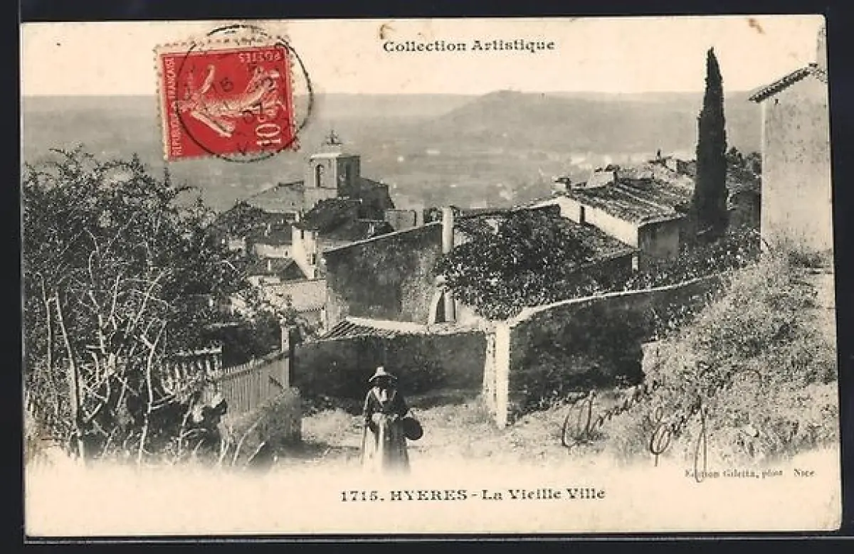 AK Hyères, La Vieille Ville avec vue sur les toits et une femme dans la rue