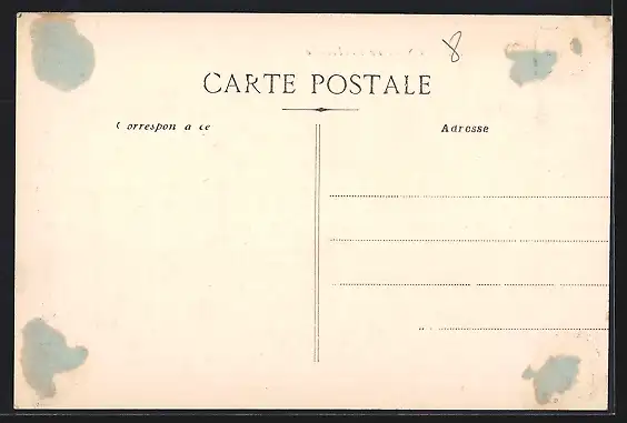 Personenbezogene Daten auf der Rückseite der Karte wurden durch blauen Textmarker unkenntlich gemacht. Die blauen Stellen sind auf die Vorderseite durchgeweicht und wirken sich negativ auf das Postkartenfoto aus