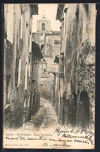 AK Hyères, Rue Paradis avec vue sur l`église en arrière-plan