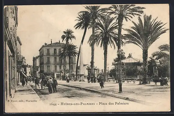 AK Hyères-les-Palmiers, Place des Palmiers avec passants et palmiers majestueux