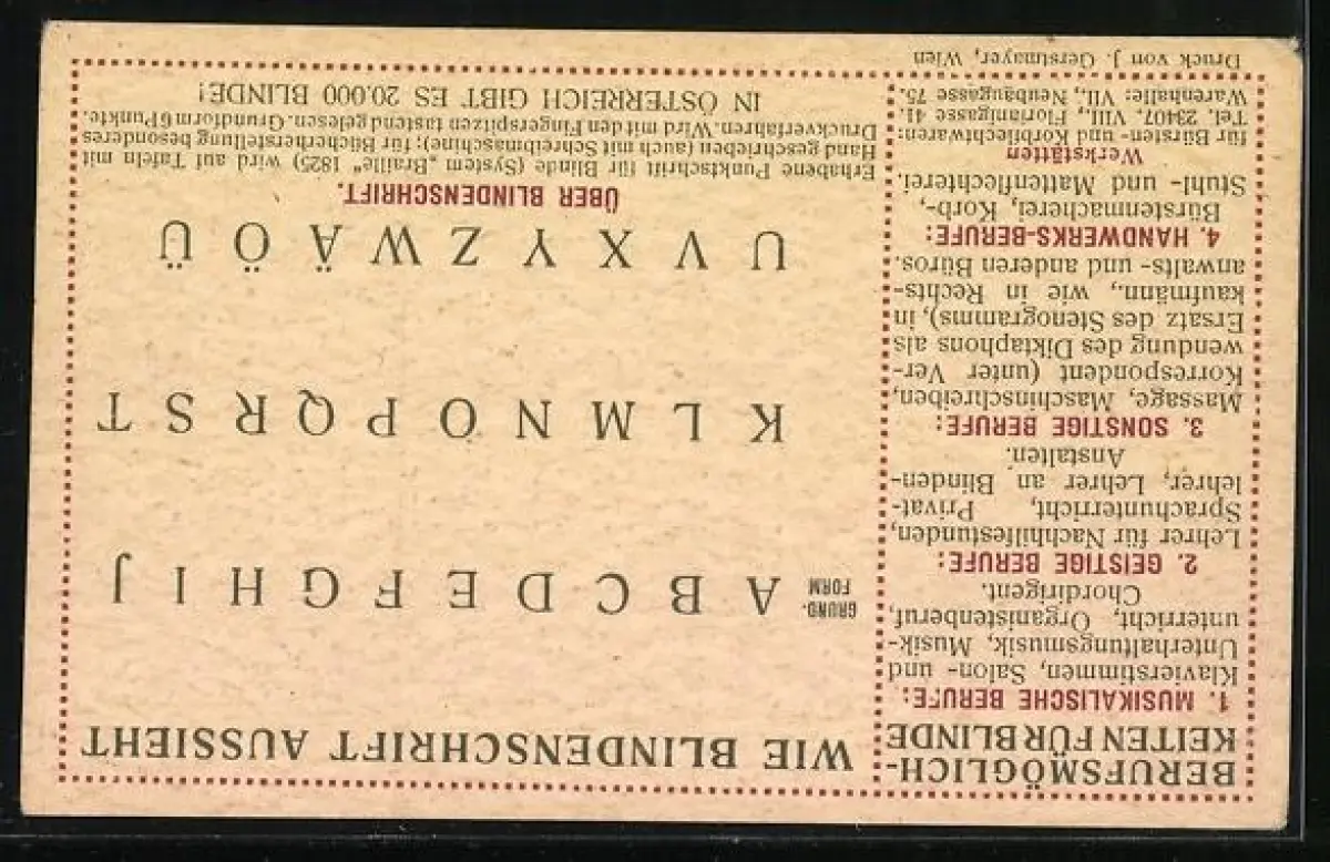 AK I. Österreichischer Blindenverein, Erklärung der Blindenschrift, Berufe für Blinde