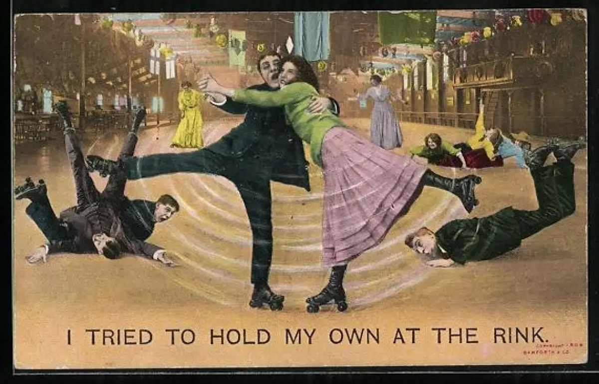 AK I tried to hold my own at the rink, Liebespaar läuft Rollschuh