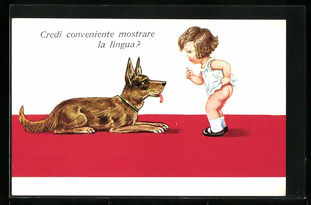 AK Ich finde es nicht anständig, die Zunge zu zeigen!, Kind schimpft mit Hund