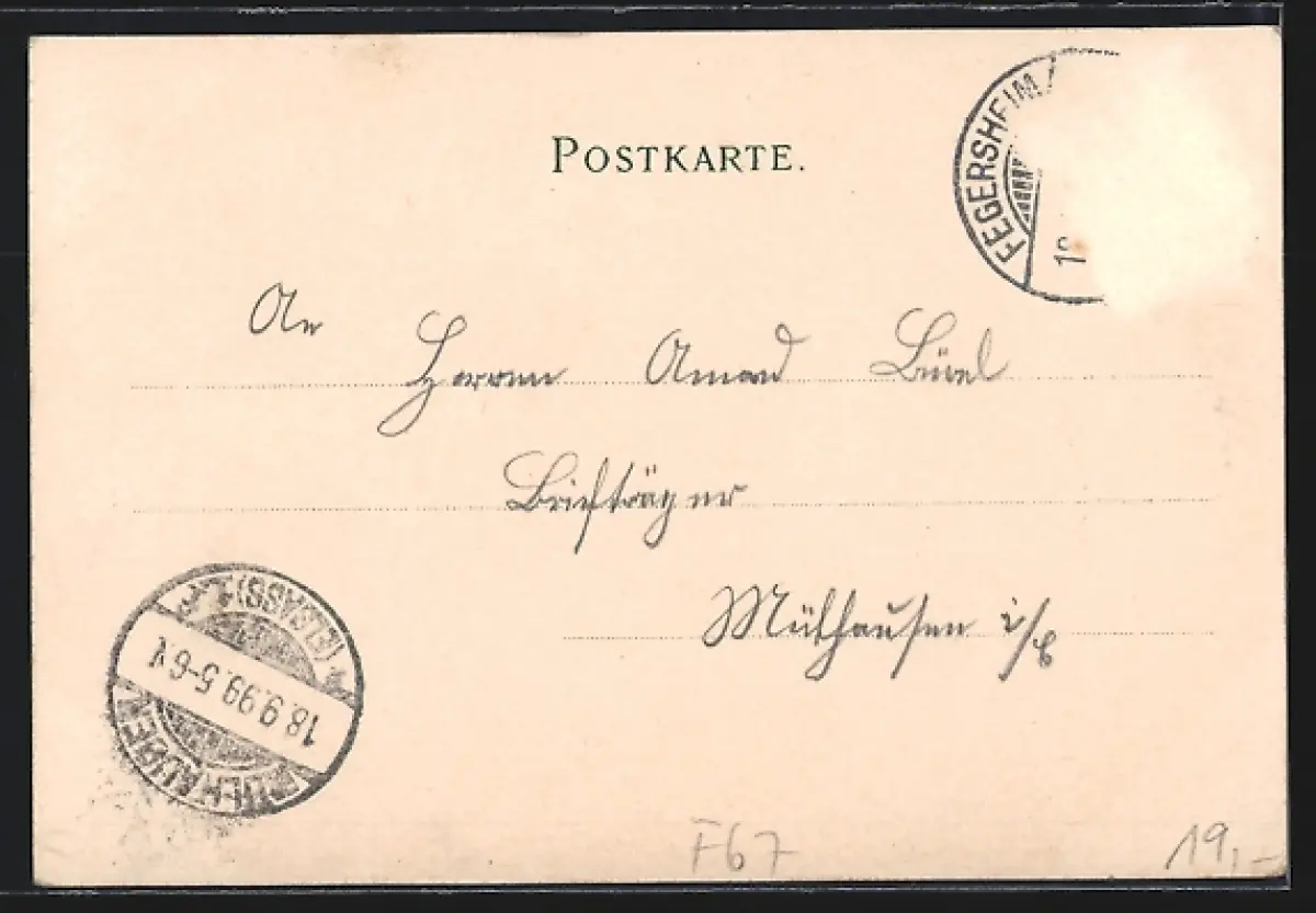 alte Ansichtskarte, gelaufen 1899, Briefmarke entfernt, rückseitig Oberflächenschaden, Bugspur li. oben, guter Zustand